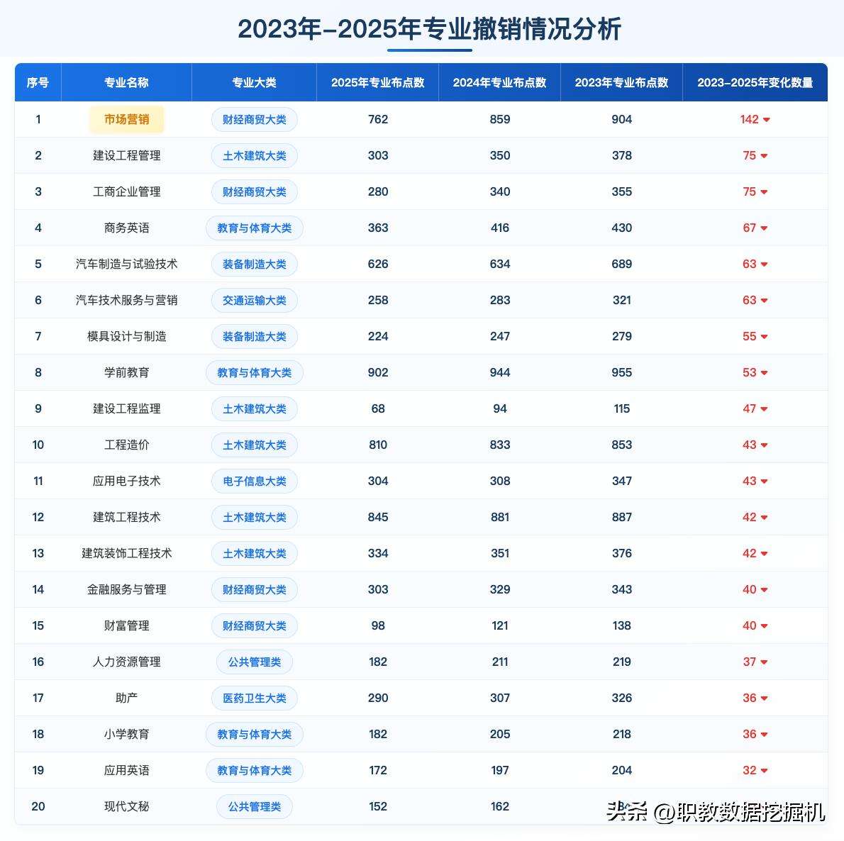 市场营销 专业在2023年设有 904个专业点,但随后,布点数量逐年减少,共撤销了 142个专业点,成为2023-2025年 撤销数量最多的专业。
