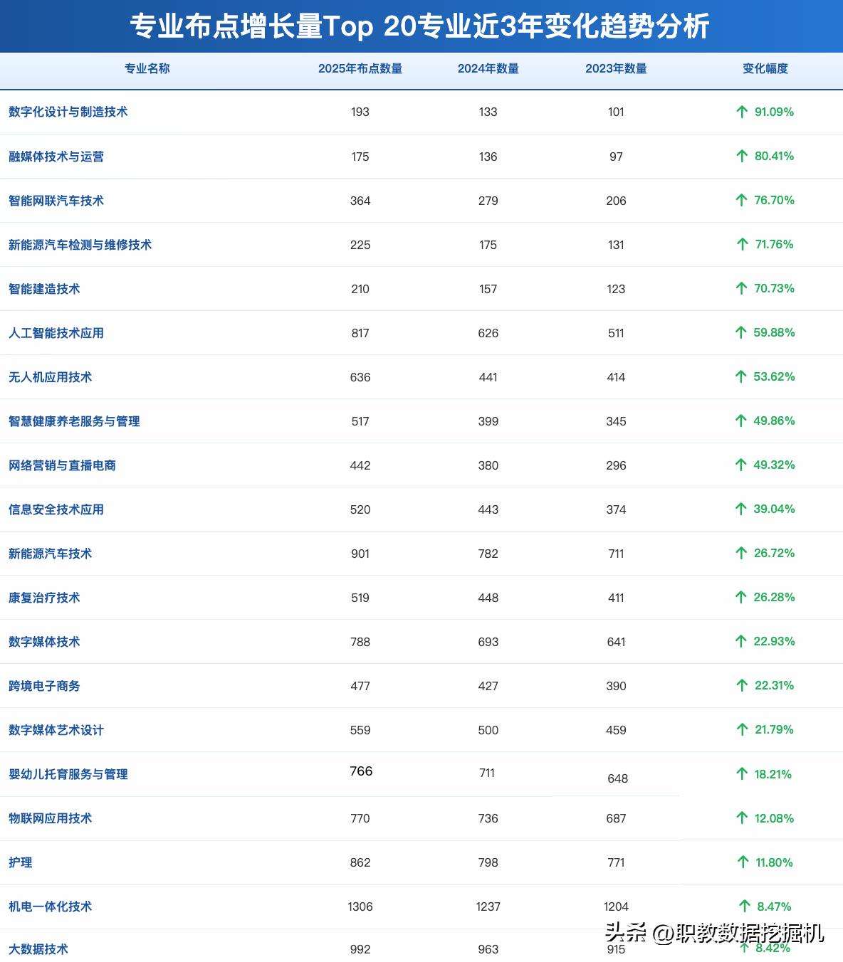 以上,是对2023-2025年高等职业教育专科专业布点动态变化的分析,从中可以清晰地体现出这三大“推手”推动的力量。