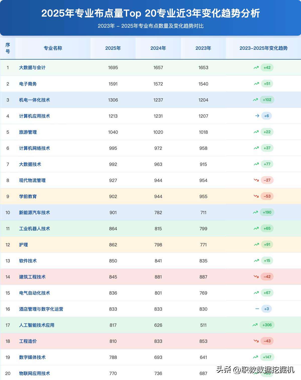 先看这张图,2025年高职专科专业布点总量前20名的专业,最近3年的变化情况。